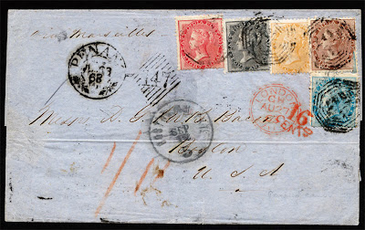 Scrisoarea din imagine a bătut lumea, la vremei ei. Ea poartă o francatură în cinci culori cu mărci din India britanică, utilizate însă în exteriorul coloniei, în Penang (Malaezia). Scrisoarea a fost expediată îm 1863 din Asia de Sud-Est către Boston (Statele Unite), via Londra şi Marsilia, având toate ştampilele şi adnotările necesare. Scrisoarea este una dintre piesele celebre care au aparţinut vestitei colecţii Seybold, la începutul secolului XX. Ea este oferită acum pentru 15.000 euro.