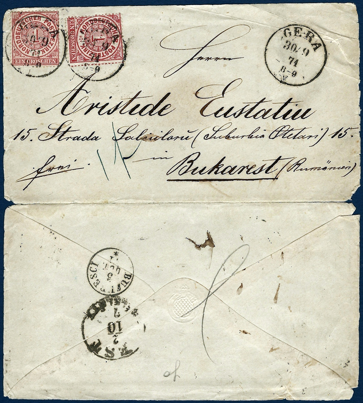 Plicul a fost expediat din Confederaţia Germană de Nord în septembrie 1871 la Bucureşti, via Pesta, fiind francat cu două mărci de câte 1 grosch din a doua emisiune a confederaţiei. Plicul nu a avut un succes deosebit, fiind vândut cu numai 18 dolari (nu au existat decât două oferte).