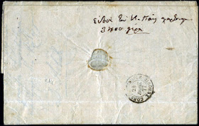 Pe faţă se distinge ştampila liniară cu cadru dreptunghiular MER NOIRE, ceea ce atestă faptul că scrisoarea a fost transportată cu unul din vasele franceze din Marea Neagră.